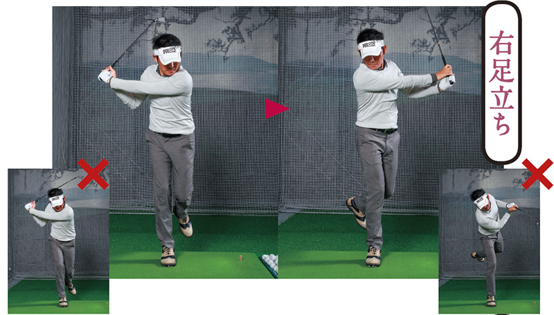 右足だけで立ち、素振りしてみる。右ヒザ、右腰の曲げる角度をなるべく少なくするほうが、バランスをキープできることがわかる。