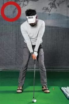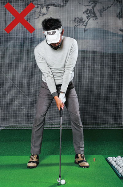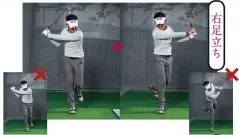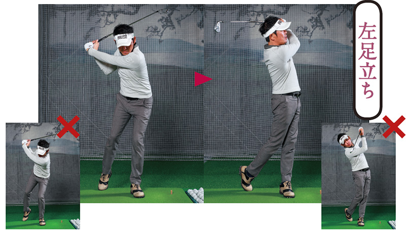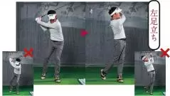 それでも下がり切らないヘッドを地面に届かせるために、必要なぶんだけ前傾する、というイメージなら、ほぼ直立姿勢と同じバランス感覚をキープして振れる、というわけです。この感覚をつかむのには〝片足立ちドリル〟がオススメです」(森)