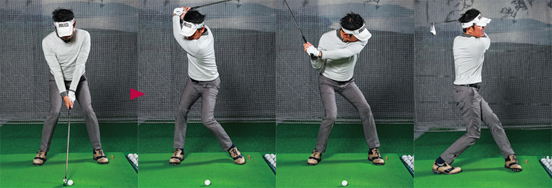 「ホーガンのフットワークや腕の振り方をマスターするには、両ヒザを内向きに絞り、前傾を浅めにするアドレスは必須です。ヒザを絞らなかったり、前傾を深くしているプロもいますが、筋力や運動神経の良さに頼らなくて済むのがホーガン流の真骨頂です」(森)