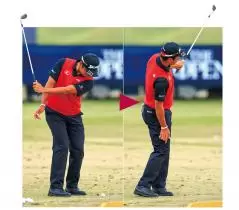 「ホーガンの場合、両ワキを締めて、しなやかに腕を使ってクラブを走らせるのに、体の動きは〝従〟であってほしい。スムーズなターンを促しつつ、バランスが崩れないようにするには、前傾せずに振るのが一番。でも、それでは地面にあるボールを打てないから、ヒザに適度な〝弾力〟を持たせるぶん腰を約5センチだけ下げる。