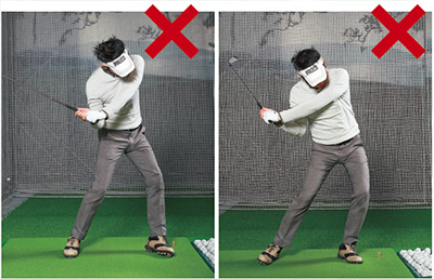 「意識的に左ヒザでリードしたり(左)、腰をスライド(右)させたりして、体の開きを抑えようとすると、スイング動作を崩してしまう。腰は多少スライドするが、それは右足の踏み込みだけで十分」(森)