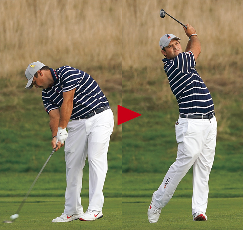 マスターズのディフェンディングチャンピオンのパトリック・リードは、インパクトで左足カカトが浮き気味。「切り返し直後を見ると、左腰はターンしているのに左ヒザは残すよう下に向けたまま。結果、体が開かず、コントロールの効いたショットが打てています。フィニッシュでは、左足カカトが内側に入って体の負担をなくしています」(森)
