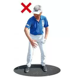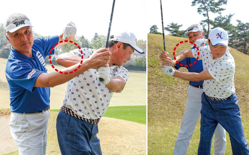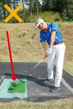 右腕全体を返してアドレスすると、ダウンで右ヒジが外に張り出すようになってしまう。