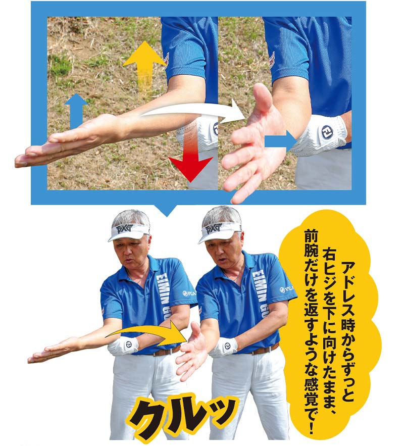 ワンポイントレッスン:右前腕部の内側を上に右ヒジを下に向けてスイングしよう!