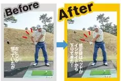 Before:右ヒジが外に張り出したこのダウンスイングだと、クラブが外から直線的に下りてきてスライスに。