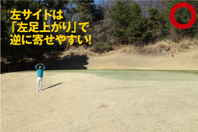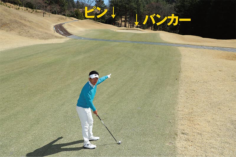 なぜ逆サイドを狙うのか? もちろんバンカーを徹底的に避ける、という意味合いもありますが、次のアプローチを考えてもこちらのほうが断然おすすめなのです。
