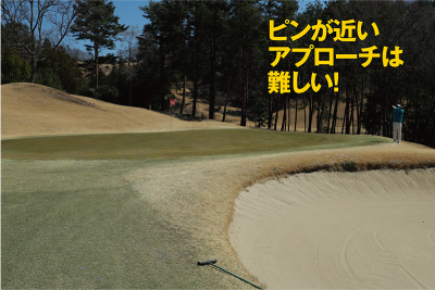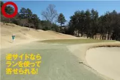 もしピン方向を狙ってバンカーをうまく越えたものの、グリーンの右サイドに外れた場合は、エッジからピンが近いアプローチが残ります。「ランが使えない寄せ」が求められ、難度があがります。こうなると、余計なプレッシャーがかかってトップしたり、ザックリしたり……、グリーンそばからグリーン周りを行ったり来たりするという、最悪の事態に陥ることも……。