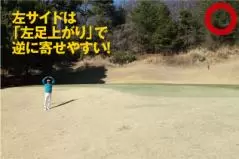 ですが、実は左サイドは、傾斜以外は何もないイージーなライ。バンカーや池など落とし穴の多いピン方向は狙わず、真逆の左のラフを狙って、2打目で確実に乗せる作戦のほうが無難なのです。