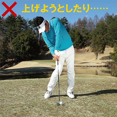 あとは、こうやって絶好なライを作ったわけですから、練習場のイメージで力まず振り抜くだけ! ただここでも落とし穴があり……、パー4やパー5と違って“届く距離”のため、逆に欲が出てしまうのか、ガチガチにリキんで打ちにいったり、普通に打てば上がるのに球を上げようとしてすくい打つケースが多いですよね。