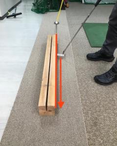 肩を縦に動かしてパターを振れば、パターが角材に沿いながら、フェースが真っ直ぐ正面を向いて動きます。しかし、肩が横に動いてしまっている場合には、パターが弧を描き、角材から離れていってしまいます。