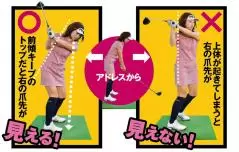 前傾した姿勢からだからこそ、上体の動きに迷って、起き上がってしまうということもあります。あえて、まずは前傾せずに上体だけの動きを確認してみましょう。背中(みぞおちの後ろ)と両腕だけをねじる感覚でテークバック。トップからそれをアドレス地点に戻したら、やはり背中と腕だけをねじりフォローへ。この正しい上体の動きを先に完成させてから、前傾して本当の素振りへ。