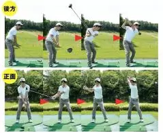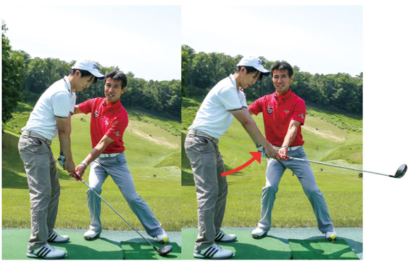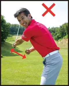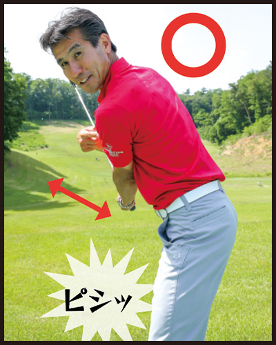 腕だけでテークバックしてしまい、腕と体に無用な空間が。これではクラブが正しい軌道から外れてしまう。