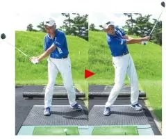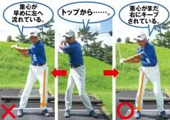 ダウンスイングのとき、早めに体重が左へと移り、パワーが逃げてしまっているところを修正しましょう。