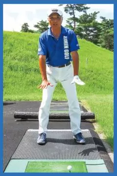 左足を1足分後ろに引き、右脚前の半身になる。あらかじめ体重は右脚内側にかけておく。そのままテークバックし、右脚内側だけに1本の軸があるイメージのまま球を打ってみる。打球は低めでOK。