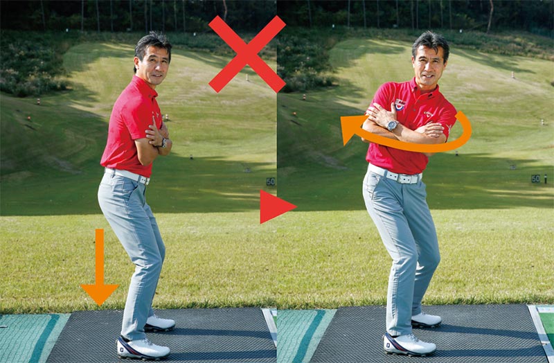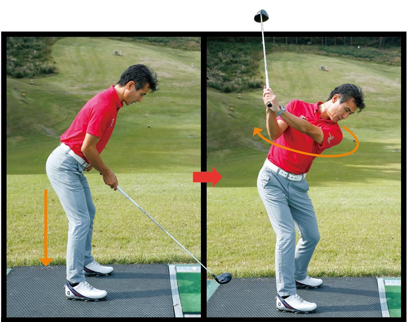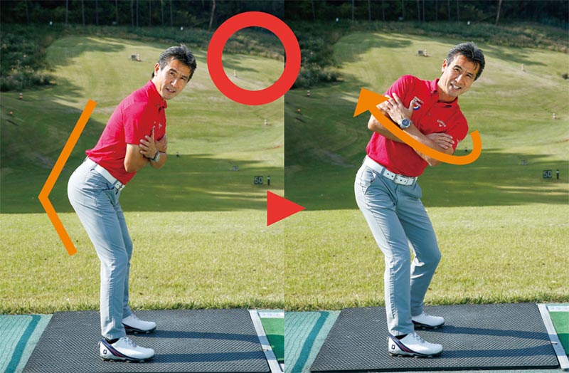 〇:股関節を折って前傾アドレスを作れば、上体が傾いたままで正しい軌道に。