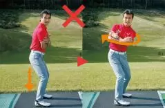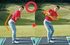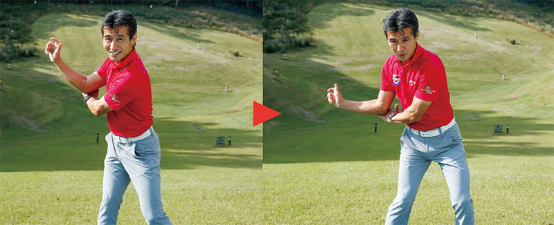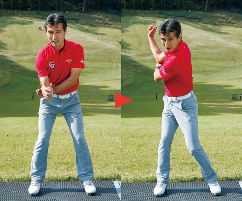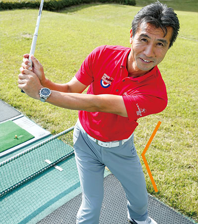 左手手首を甲側に曲げ、それを右ヒジの後ろに当てがうかたちで、右ヒジを90度に曲げてテークバックします。腕でトップまで行こうとしてしまうのではなく、あくまでも肩の回転で上げていくのが大切です。こうしてできた正しいトップを、何度もこれを行うことで体に染みつかせましょう。