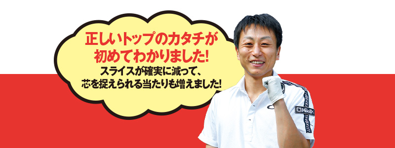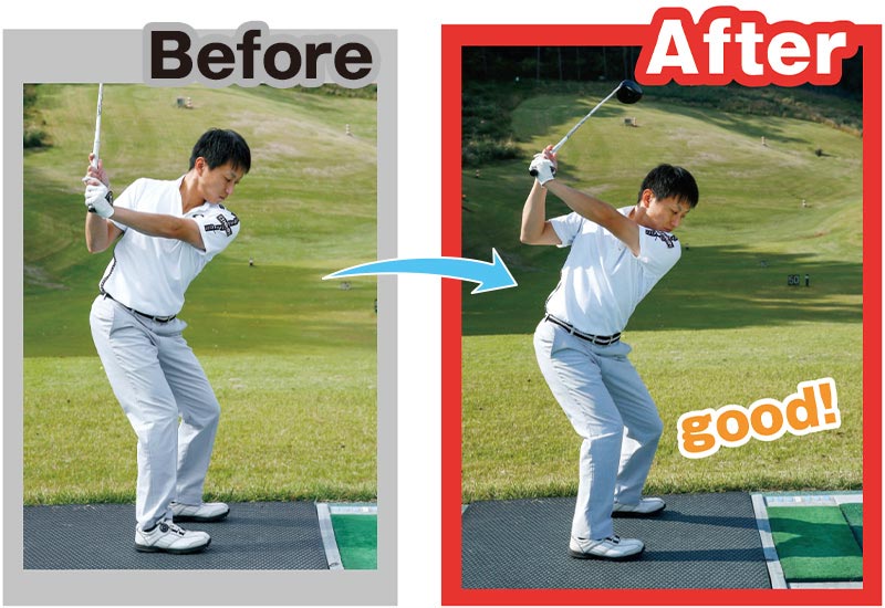 その結果、右ヒジが体にくっついたトップとなり、球をカット気味に打ってしまうことが、スライスの原因になっていたんです!
