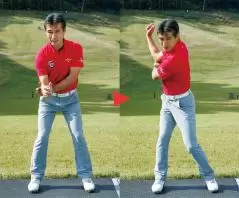 ワンポイントレッスン:テークバックでは、右ワキをリラックスして右ヒジを体から離してターンしましょう。