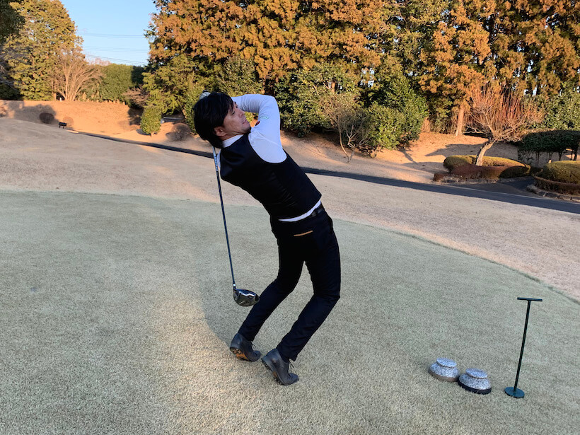 振り切ったところから少しクラブを戻し、グリップを左腰あたりに持ってきて、クラブがちょっと立ったような状態でボールの行方を見守る。これなら体に負担もかからないし、けっこうプロっぽくてかっこいい。