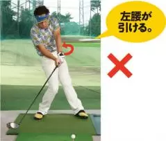 左腰が引けてしまうと、体重が左足に乗らず、体がアドレスの位置に戻らない。