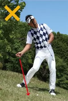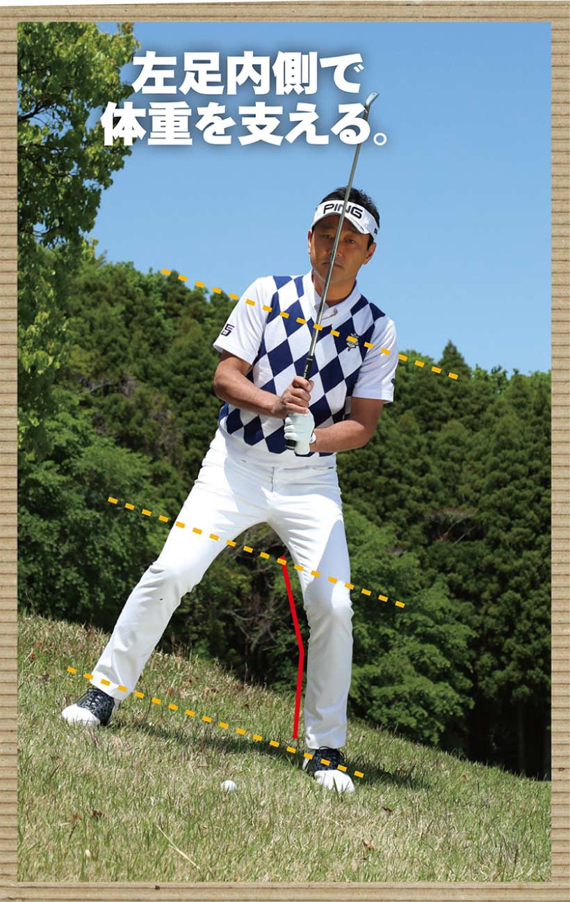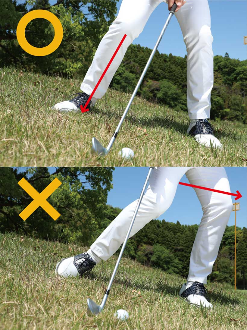 右足カカトで地面を踏み、上げないようにガマンすれば軸が安定しクリーンヒットできるが、左足下がりの傾斜でさらに右足カカトをスイング中に上げてしまうと、体が左に流れて新たなミスを招いてしまう。