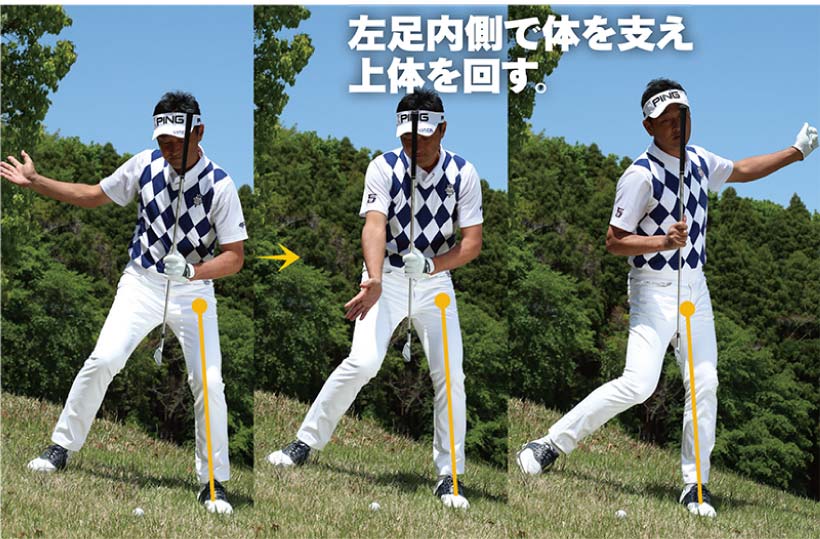 そのためには、傾斜と肩を平行にするように構えたら、左に体が流れないよう左足内側で体を支えたまま、アドレスで作った上体の傾きを変えないように上体を回すのがポイント。そうすれば、確実にクラブが上から入ってくるため、手前をダフることなくクリーンヒットできるようになります。