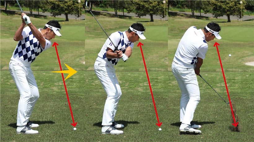 「左足下がり」で体の上下動が起きるとスイング軸もブレやすい。アドレス時の“地面と目の距離”を変えないようにフォローまで保とう。