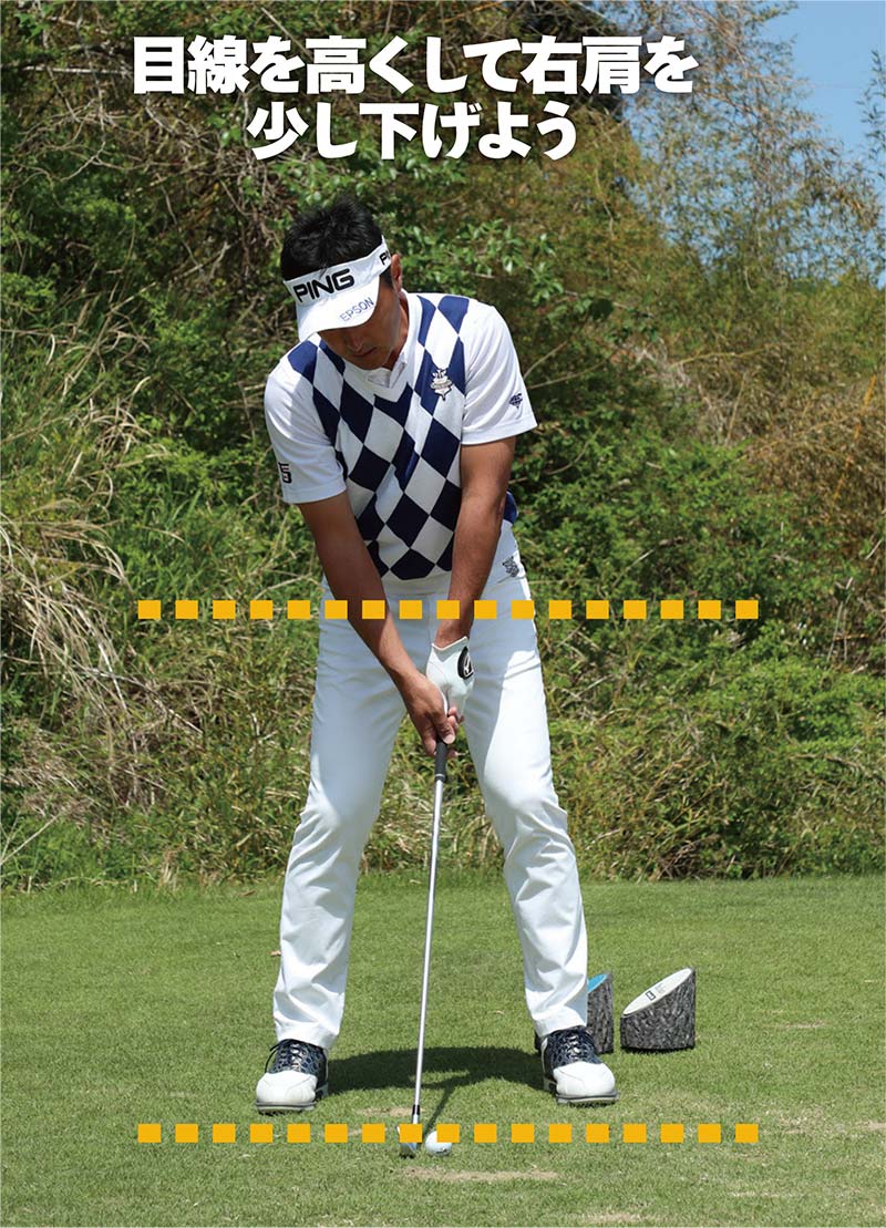 目線を低い位置のグリーンに向けると、トップで左に、インパクトでは右に傾いてしまうダフりを招く。