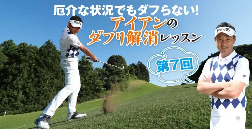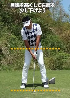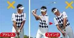 「打ち下ろし」パー3でダフってしまうのは、地面より低い位置のグリーンに目線を向けること上体が左に突っ込んで左肩が下がった構えになることが原因。こうなると、トップでは余計に左に傾き、インパクトでは逆に右に傾いてしまう“ギッタンバッコン”スイングになって、ダフリやすくなるのです。