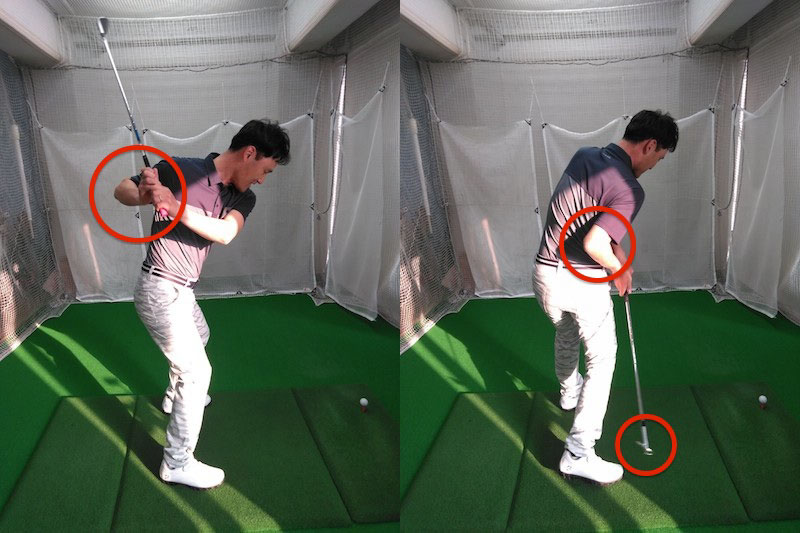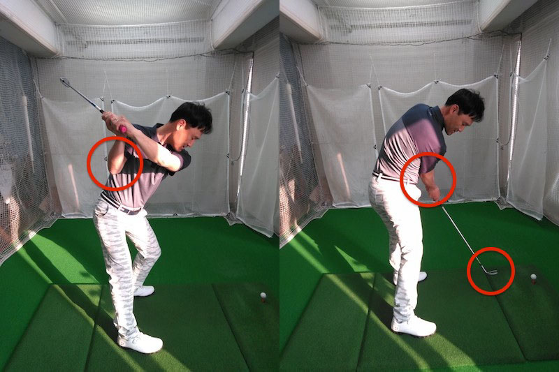 バックスイングの時に体を回せず手だけでアイアンを上げてしまうと、右肘(ひじ)が体から離れて後ろに引いた状態になります。このまま打とうとすると、振り遅れてフェースが開いたままダウンスイングを迎え、シャフトからボールに当たってシャンクしてしまいます。