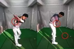 バックスイングの時に、体がしっかり回った状態で右肘が体から離れなければ、ダウンスイングでフェースが正面を向いたまま真っ直ぐ入ってインパクトできます。バックスイングの時に、右肘が右腰よりも内側に入っていれば振り遅れずスイングできます。