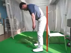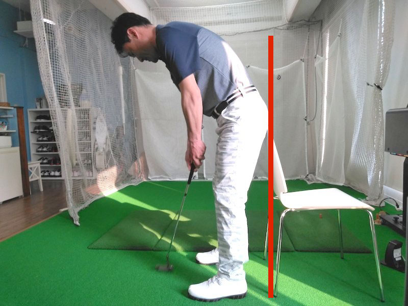 上の写真のように、お尻を椅子や壁につけた状態でパターをストロークします。テークバックからフォローまで、お尻が椅子や壁から離れないように注意しましょう。