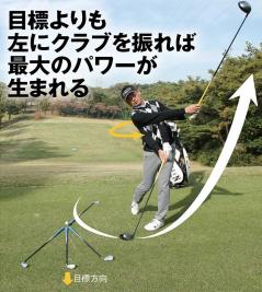 右手首の角度をキープし、目標より左にクラブを振るだけで飛ばしのパワーは最大に!