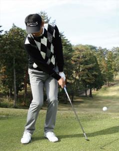 アプローチが巧いプレーヤーは、足から根っこが生えているかのように下半身が安定しています。実はこの下半身安定こそアプローチ上達の一番の決め手。スイング中に下半身がグラグラしやすい人は、ツマ先下がりの斜面で素振りしてみてください。下半身に結構張りが感じられますが、練習でもコースプレーでもその感覚を大事にしましょう。