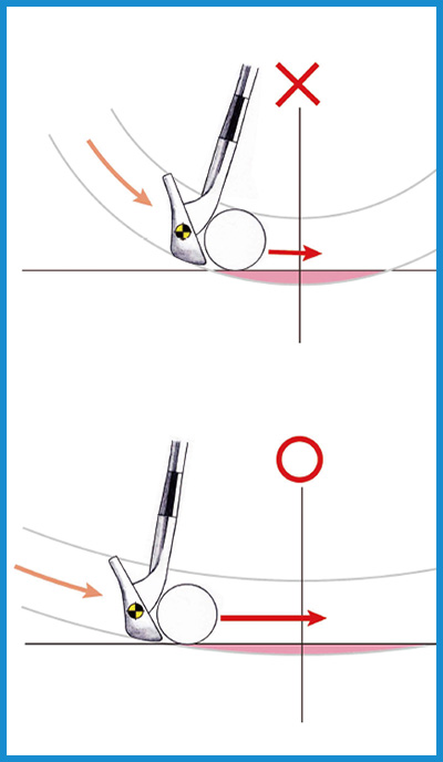 効率よくパワーを伝えるには、ヘッドの動きのベクトルを弾道ラインに近づけること。なるべく入射角をゆるやかに。