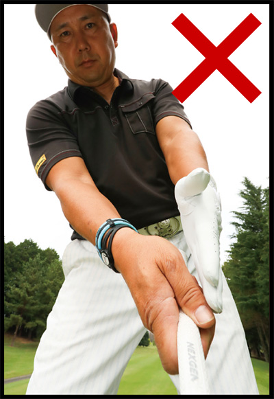 握る強さは、誰かにクラブを引っぱられたときに、スポッと抜けるくらいの超ゆるゆるが正解。肩、ヒジ、手首をやわらかく使えるので可動域が広がるうえ、シャフトのしなり性能も生かせる。