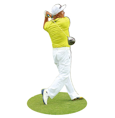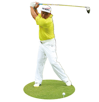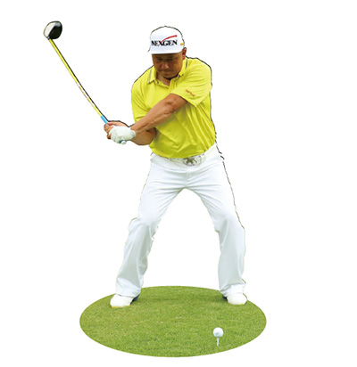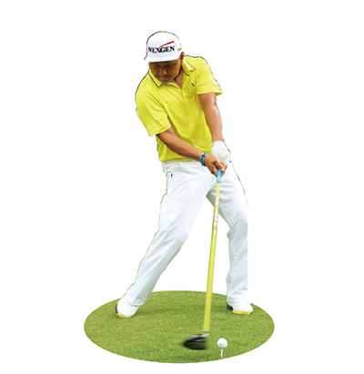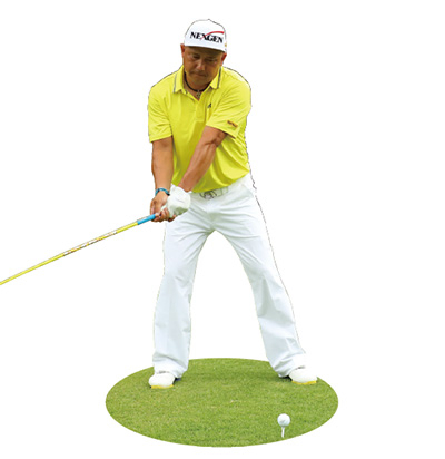 ヒール側を意識してシャットに始動する。テークバックからトップにかけては、右脚が完全に伸び切るくらいに股関節を上に上げる。腰を回転させると、上半身が左右に動いてしまい捻転差が少なくなりパワーが生まれない。