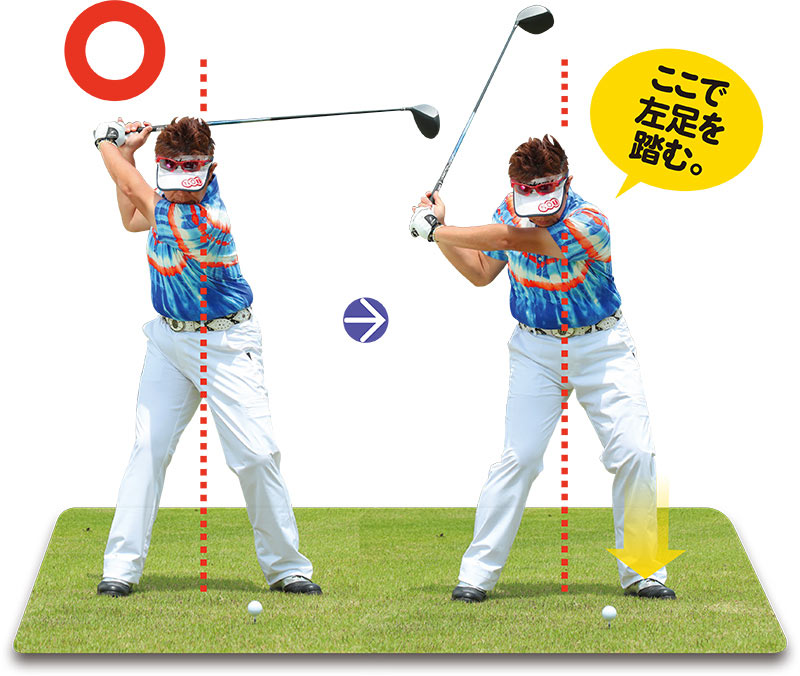 切り返しでやるのはコレだけ。左足に体重移動をしようとしたり、腰を切ったりする必要はありません、この踏む力を強くすれば、体重が左足内側に移り、クラブは自然に体の正面に戻ってくるのです。