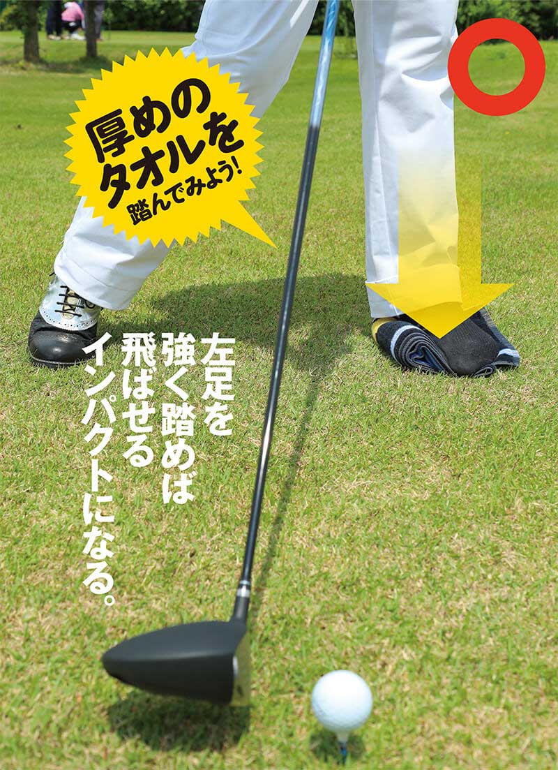 左足でを踏み込む感覚を体感するには、厚めのタオルを左足の下に置いて、切り返しで踏んでみるのがおすすめ。左足の裏全体で地面を踏むことによって、左ヒザが伸び上がり、地面からの反力を利用して飛ばすことができる。