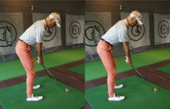 ポイントは、アイアンを1グリップ分体から離して構えて、5度でいいのでフェースを開いてセットしてから握ること。あまりハンドファーストせず、手首と肘を楽にして構えます。