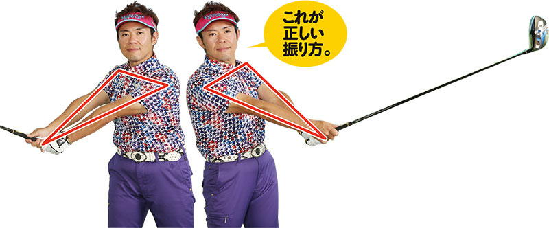 肩と腕の三角形を保って振り抜くことが重要。フォロー以降、クラブの遠心力によって手首が自然に返っていくのが理想的。意図的に返してはいけない。