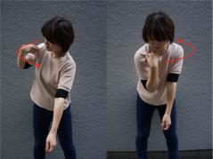 練習方法としては、右手で右肩を前からつまんで、前傾してつまんだまま体を回転させます。背骨を軸として体をぐるっと回転させると、肩が前後に動くイメージがもちやすいです。