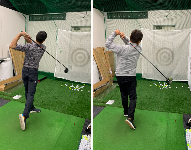 左:佐藤順。ハンデ+1のトップアマ。ヘッドスピード47。ほぼストレートで軽く右に曲がるフェードヒッター。ドライバー飛距離は270ヤード前後。栃木県佐野市のゴルフショップ「アフターゴルフ」店長。