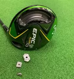 フェースに近い部分にある丸いウェイトが2gのもので、後方にある可動式の「ペリメーターウェイティング」と呼ばれる部分のウェイトが12g。成田プロはこの12gのウェイトを外して使っています。