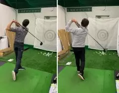 右:野村タケオ。ヘッドスピード42くらい。いかにもアマチュアなスイングで、捕まえるのがあまり上手くないフェードヒッター。スピン量が多め。ドライバー飛距離240ヤードくらい。ゴルフバカイラストレーター。