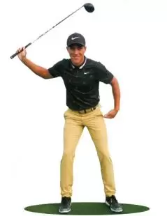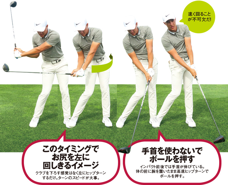 僕がスイングで一番気にしているのは、できるだけマックスのスピードでヒップターンをすることです。バックスイングで右に体をターンさせたら、切り返すよりちょっと早いくらいのタイミングでお尻を左にターンさせます。