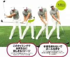 スイング中に腕や手を意図的に動かすことはありませんが、ヒップターンが早い分、手が前に出るリスクがあります。そのため、ダウンスイングではクラブを真下に下ろす。こうすることでインパクトでタイミングよくヘッドが戻ってきます。
