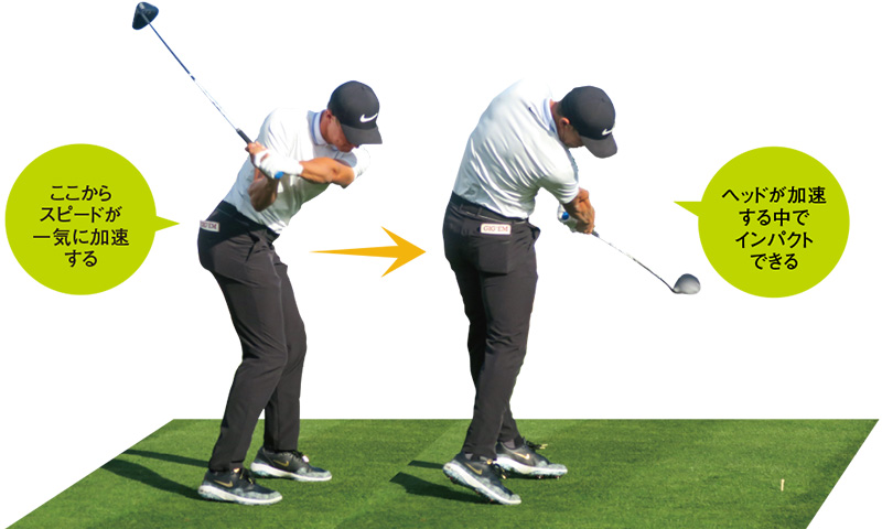 飛ばすにはヘッドスピードが欠かせないが、その大幅アップを実現させているのがダウンスイング。回転力のピークをこのプロセスにもってきている。