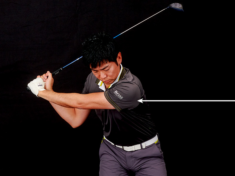 チャンプいわく「左腕が地面と平行になるまでにスピードを作り出す感じ」ということで、体の回転における加速のピークはここ。加速力の源は下半身で、速くヒップターンした結果、深いタメが作れています。ここで力のピークを迎えたら、あとは解放するだけ。
