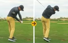 チャンプ自身も「ダウンスイングで右足を蹴るような感覚はあるね」と言っていますし、実際、ダウンスイングからインパクトで両カカトが浮き、ジャンプするような動きも見られます。